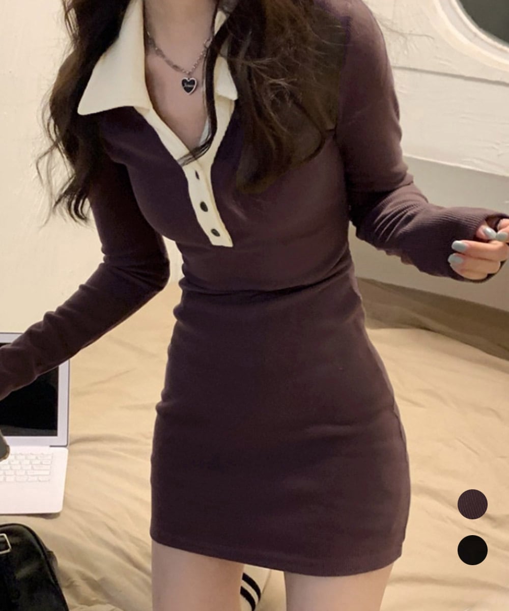 襟の配色がおしゃれなポロワンピース